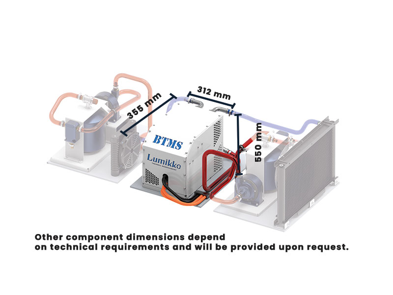 Lumikko BTMS (Battery Thermal Management System is a modular liquid cooling system tailored for electric work machines. Designed for precise battery temperature control, it adapts seamlessly to varying conditions and power demands – without unnecessary oversizing.